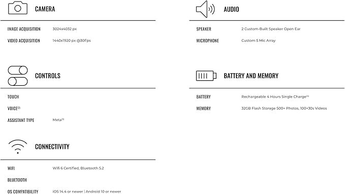 - CAPTURE WHAT YOU SEE — Take photos and record HD videos straight from your glasses with an ultra-wide 12 MP camera and five-mic system